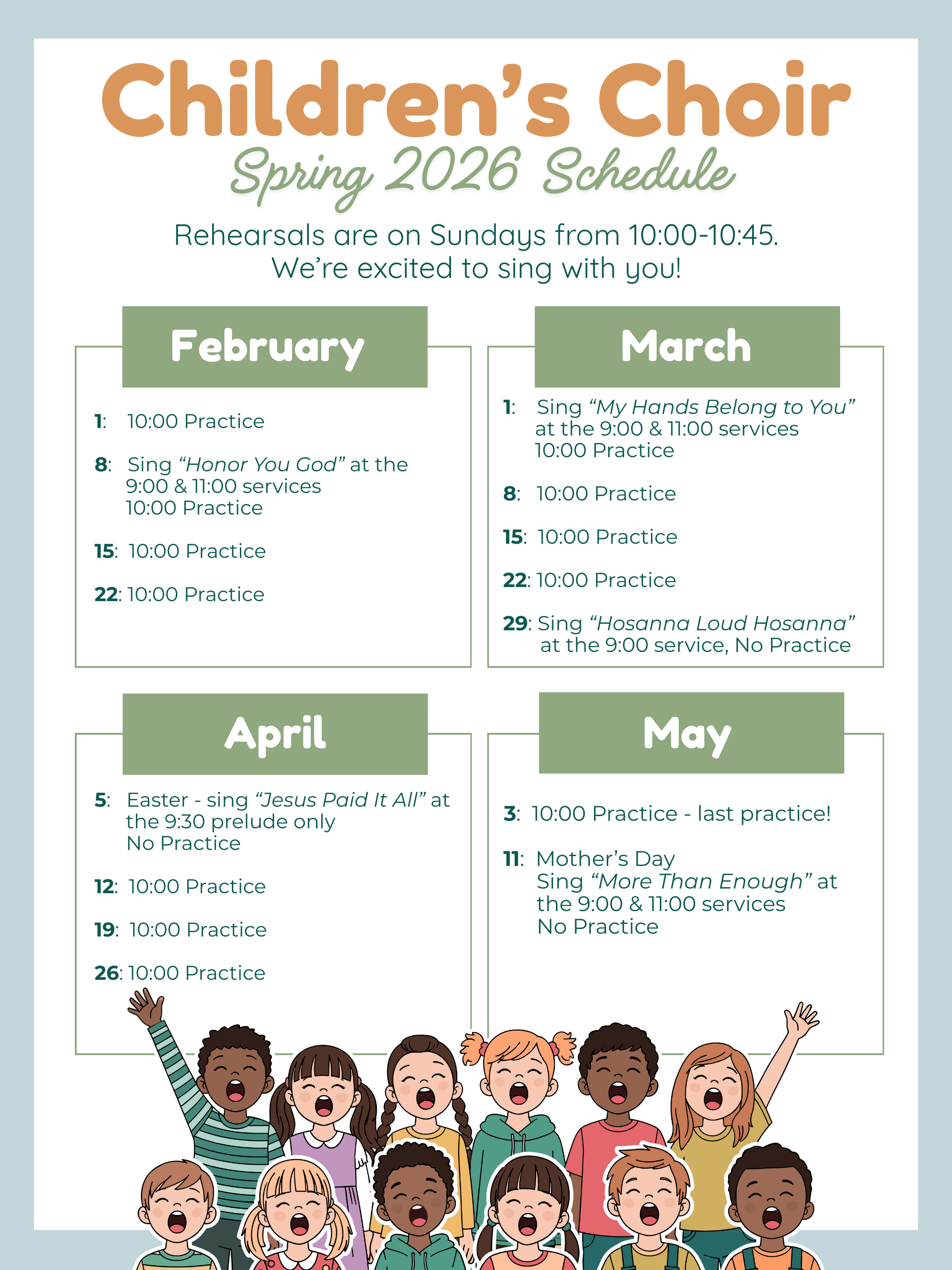 This choir is open for all children ages 3 (must be potty trained) through 4th Grade. Regular practices are Sunday mornings from 10 - 11 am in Room 112. For more information please contact James.